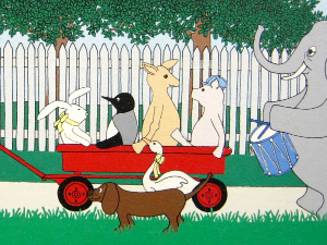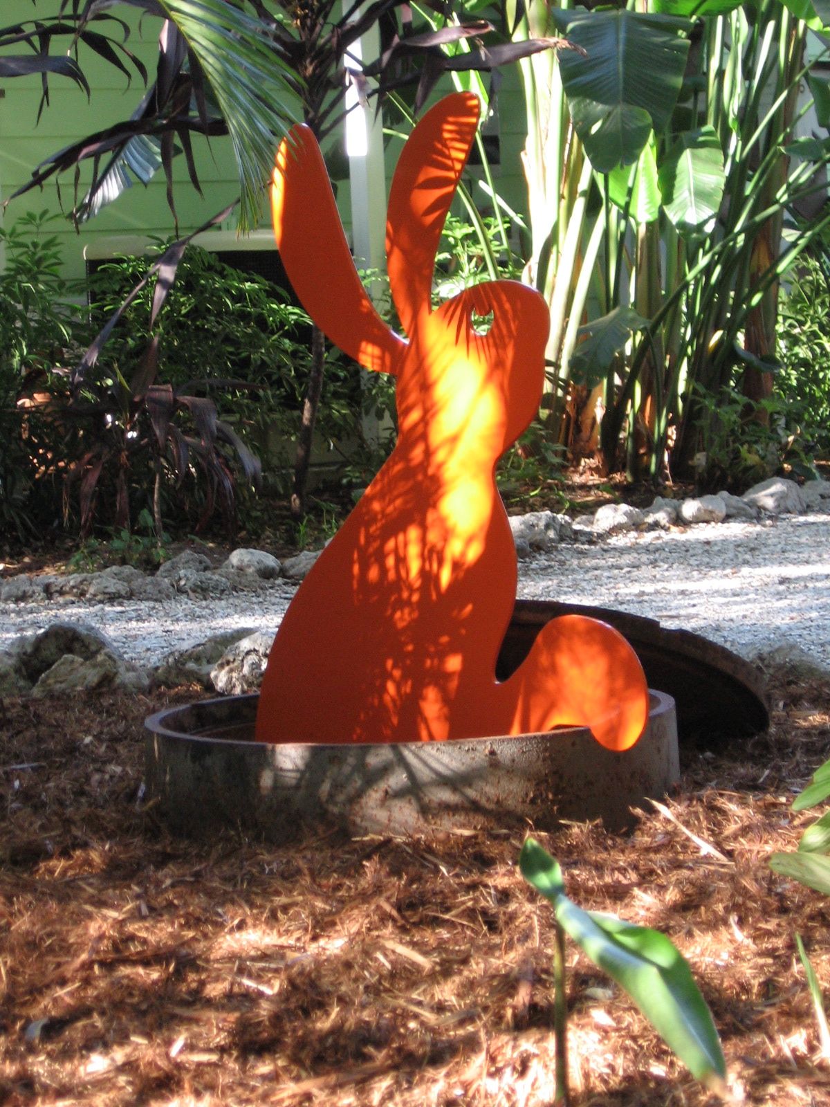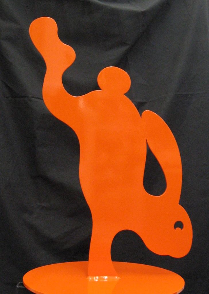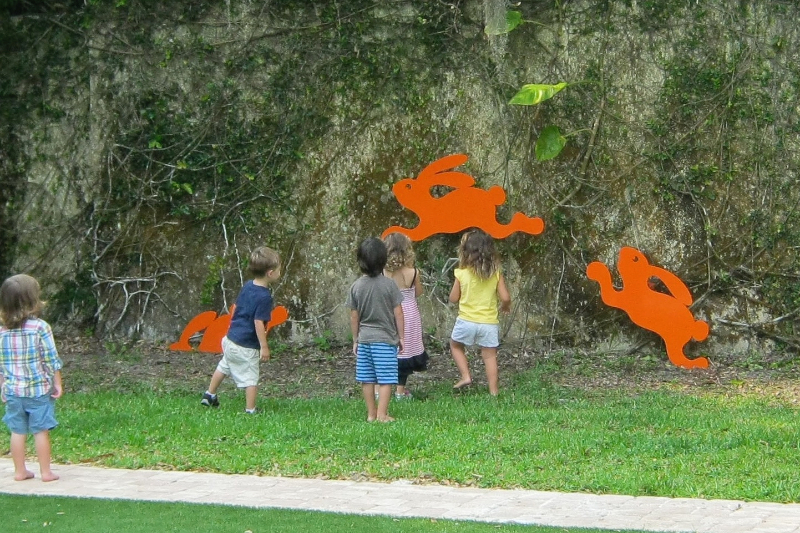 As my work developed into another dimension in the 80’s I began fooling with my whimsical animals as sculptures. The first to get cut was “Walter”. Today “Walter” has multiplied into a series of brilliant orange rabbits. Just a year ago we installed “Walter’s Frolics” in celebration of this spring holiday.