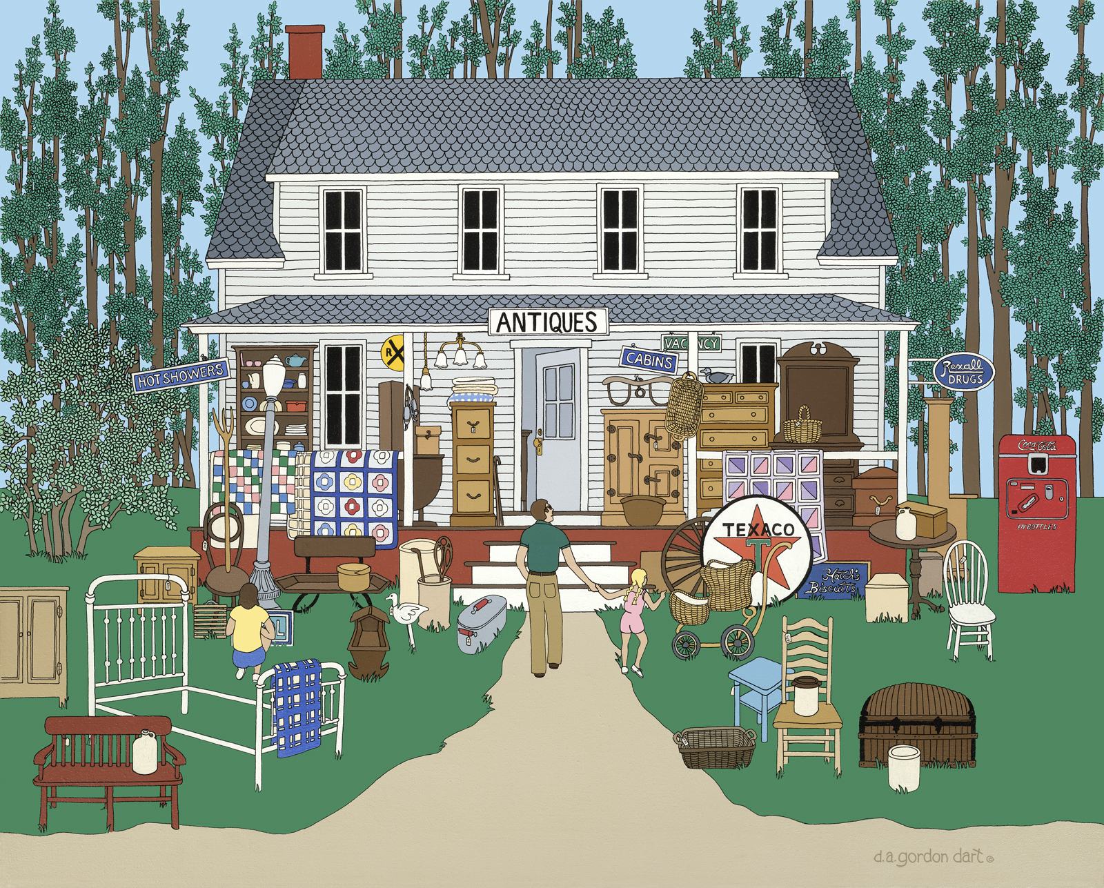 I made frequent trips to the northeast when I was drawing for The New Yorker and Bon Appetit magazines. I was always looking for new subject matter which came to mean I always had piles of crazy items and scores of photos from my trips piled in my studio. I found this amazing antique store in Maine along Route 1.