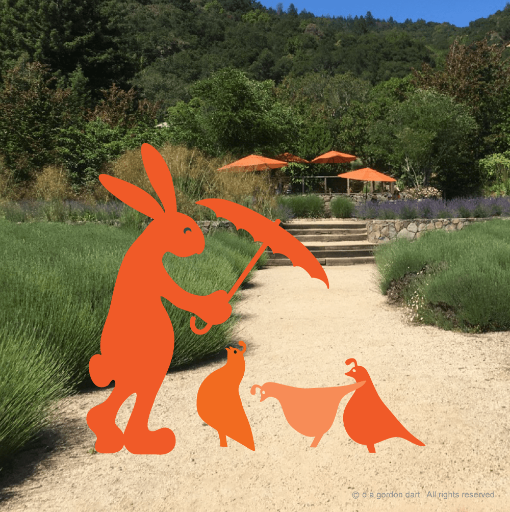 A covey of quails escorted by none other than a gentleman rabbit!